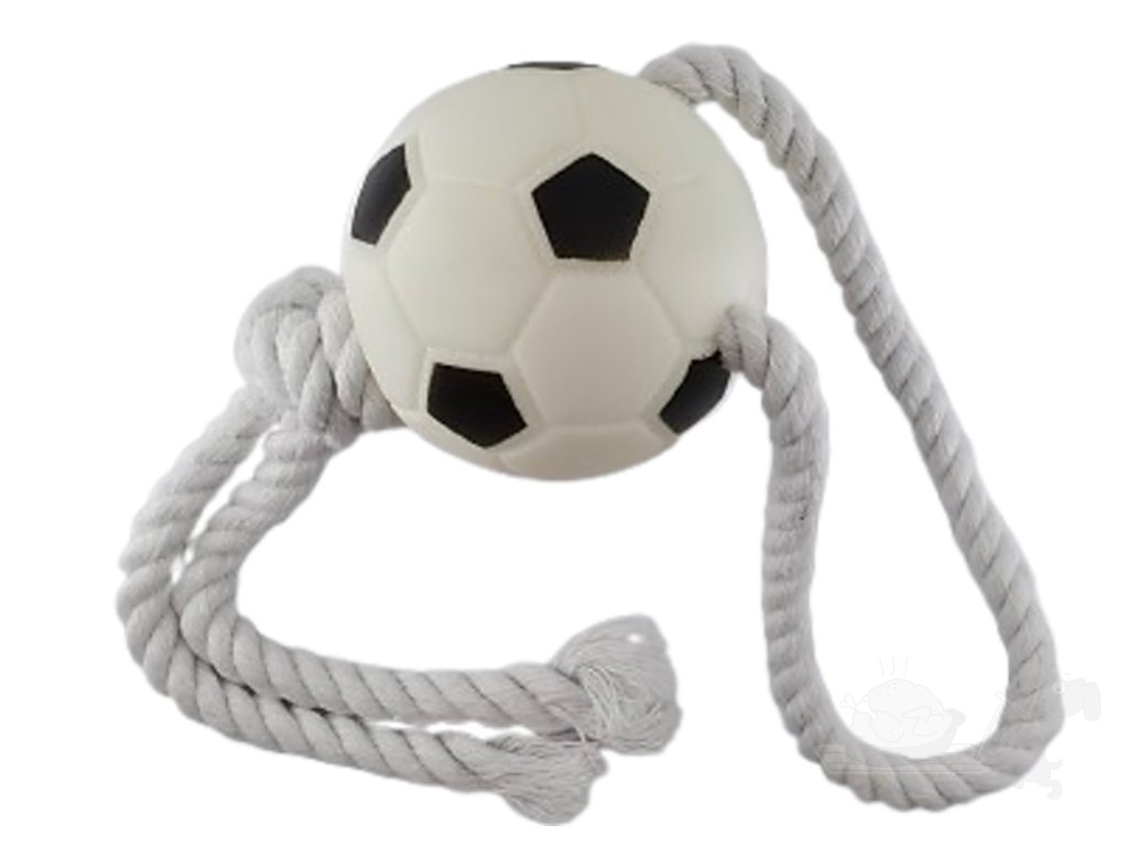 - Vinylová hračka pro psy ve tvaru fotbalového míče na šňůře.