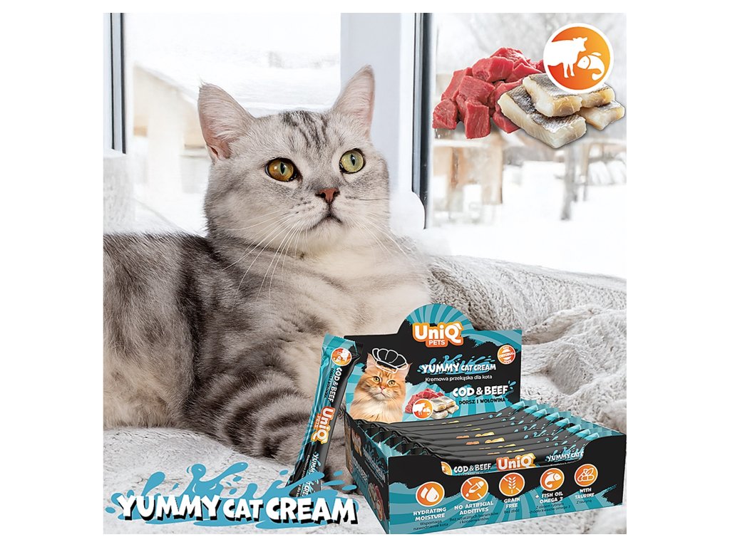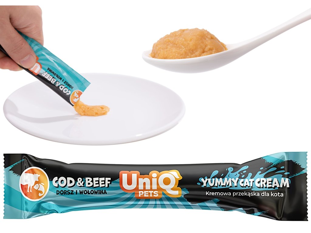 UNIQ PETS CAT lahodný krém pro kočky s hovězím masem a treskou 15g