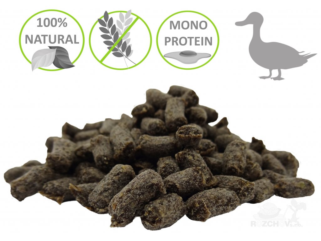 Složení: Čerstvé kachní maso a droby 30%, konopné semeno (částečně odolejované), lněné semeno (částečně odolejované), semeno světlice barvířské (částečně odolejované), maniokový škrob.