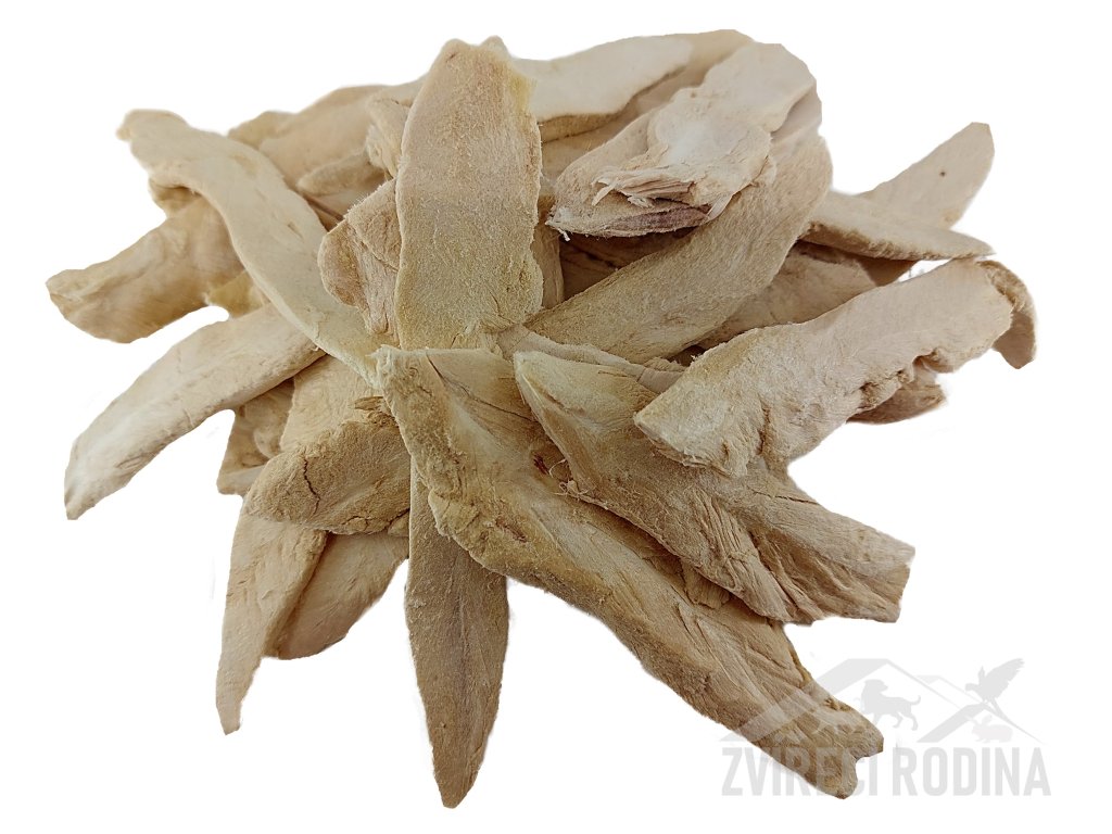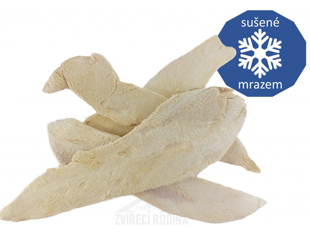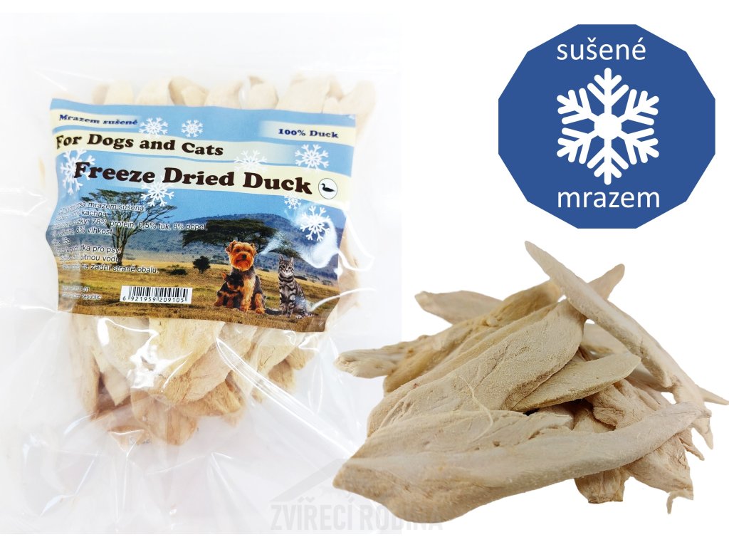 Mrazem sušené kachní prsa jsou velmi praktické na cesty. Nepotřebují skladování v lednici a velmi dobře se podávají, protože jsou křehké. Mají kvalitu syrového masa, ale můžete je vzít kamkoliv. Na rozdíl od vjetšiny nabízených sušených masíček neosahují Glycerin. (Glycerol neboli glycerin je slabě jedovatý. V menších dávkách způsobuje bolesti hlavy, žaludeční potíže a zvracení. Ve větších dávkách může způsobit poškození jater.)