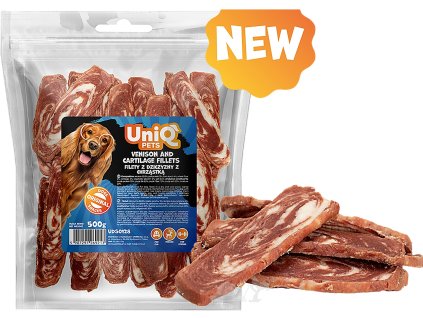 UNIQ PETS PSÍ SNACKY MASOVÉ 500g filety jelení a chrupavky - Tyto žvýkací pamlsky kombinují šťavnaté jelení maso (82,5 %) s křupavou...