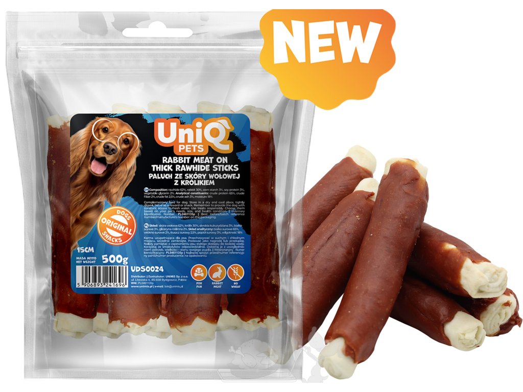 UNIQ PETS Bůvolí tyče obalené králičím masem 500g 15 cm 6ks