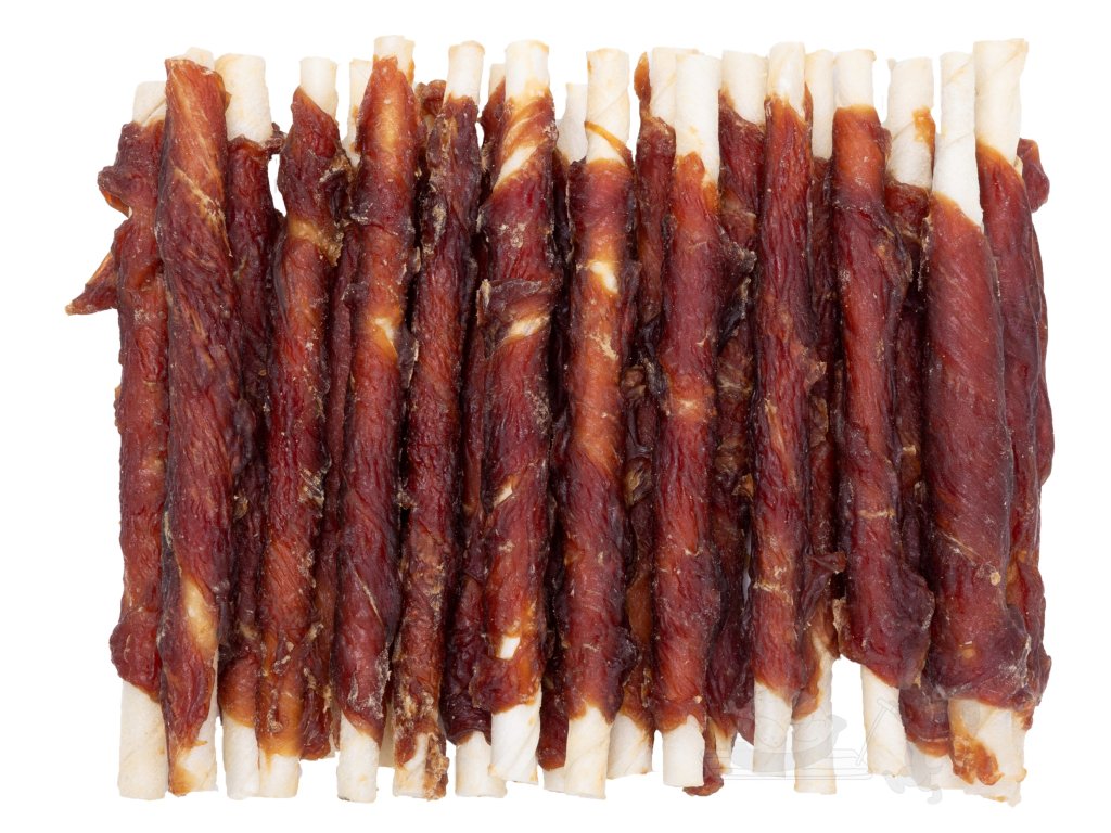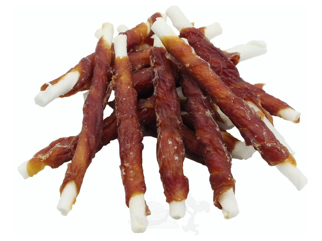 Masová pochoutka pro psy - tyčka z hovězí kůže obtočená plátkem lahodného kachního masa 250g.