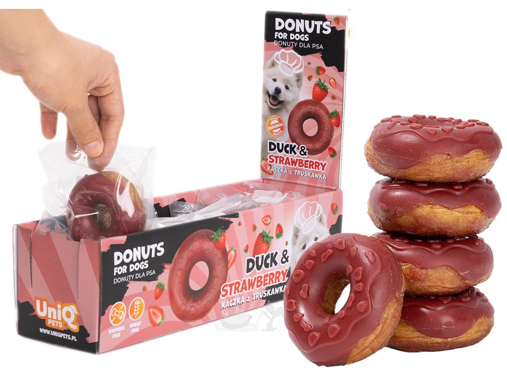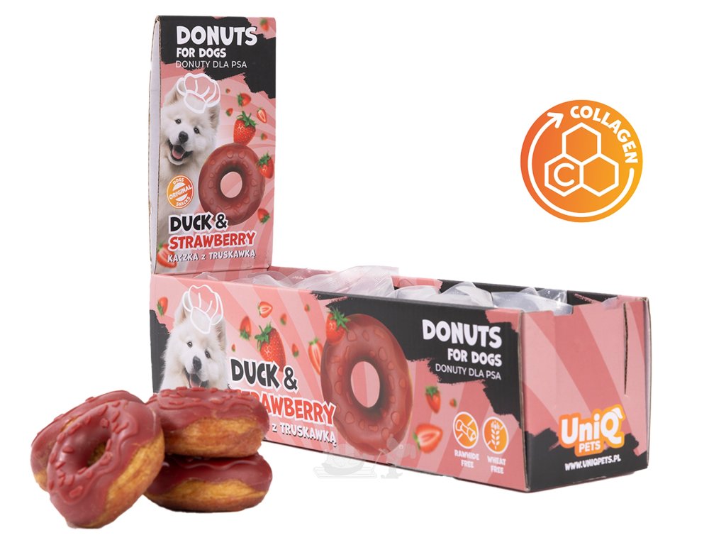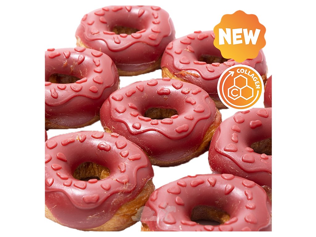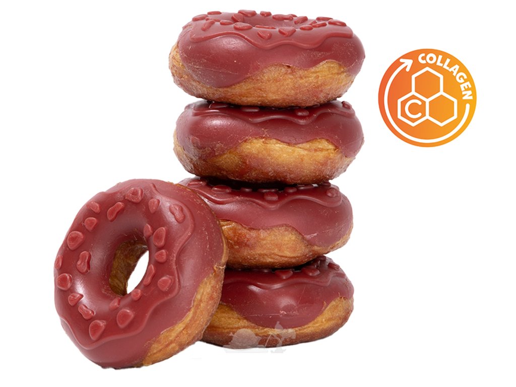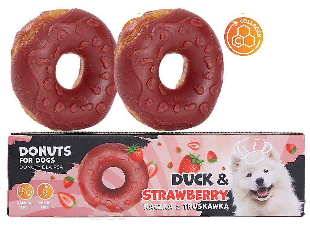 Kdo říká, že si pes nemůže dopřát svůj vlastní stylový zákusek? Naše kolagenové koblihy jsou gurmánským zážitkem, který kombinuje zábavný tvar, neodolatelnou chuť a funkční benefity. Každý kroužek je lahodnou odměnou, kde se snoubí šťavnaté kachní maso s nasládlým tónem jahod.