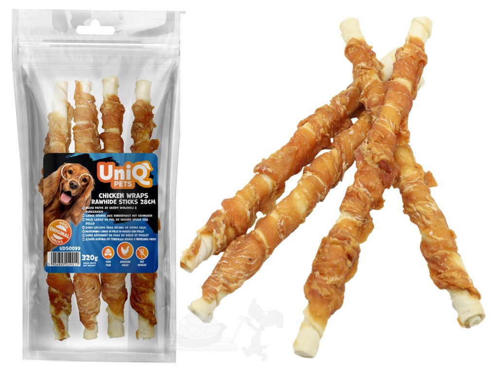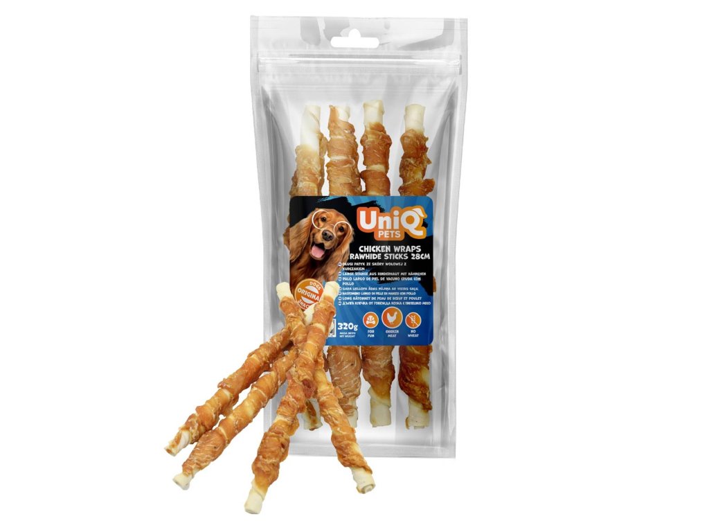 UNIQ PETS Velké tyče z hovězí kůže obalené kuřecím masem 320g 28cm