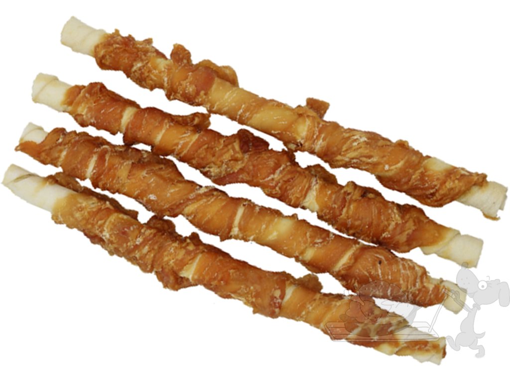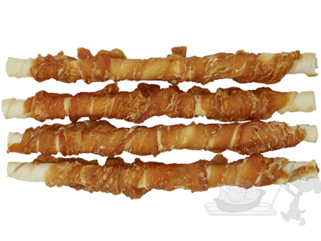 Chutné tyče z hovězí kůže, obalené kuřecím masíčkem pro ještě vyšší chutnost, si zamiluje každý pejsek.