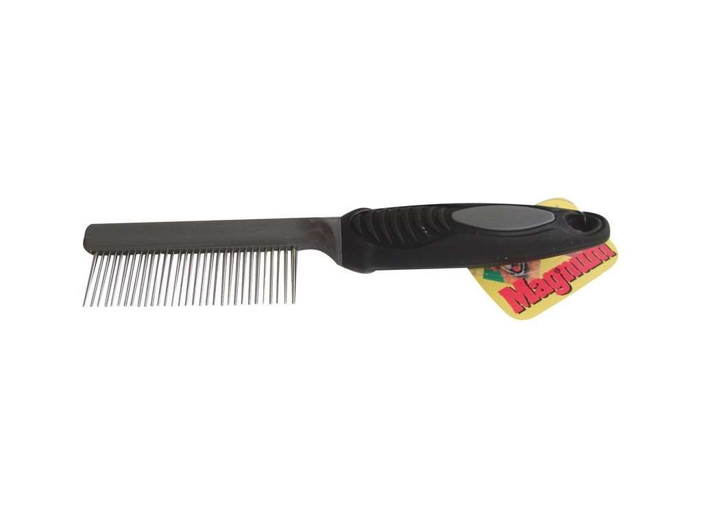 Hřeben s hustými ocelovými hroty pro perfektní rozčesání srsti včetně odstranění jemnějších nečistot. Velmi komfortní měkčená a neklouzavá rukojeť.