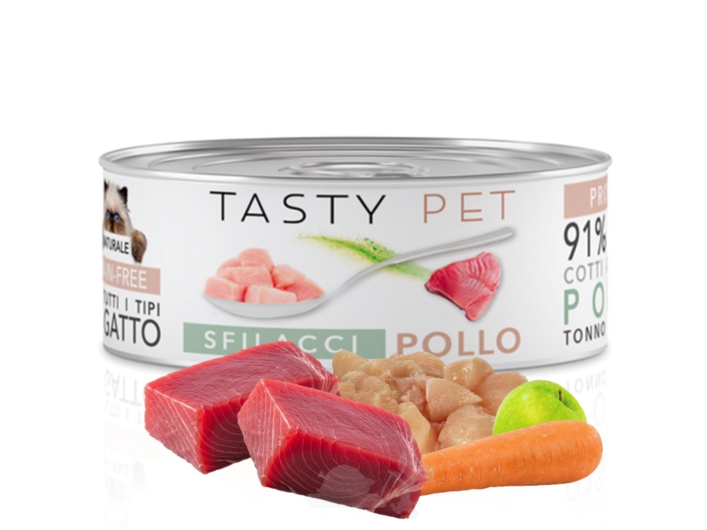 Tasty Pet – Trhané kuře, tuňák a kousky jablka (85g). Bohatá na bílkoviny – vyrobeno v Italii. Trhané kousky masa (ať už ve vývaru, nebo omáčce) vizuálně a pocitově připomínají kočce roztrhanou kořist. Kočky jsou striktní masožravci a jejich preference jsou řízeny loveckými instinkty, které preferují strukturu oproti homogenním pastám. Jedná se o bezobilnou recepturu (Grain-Free).